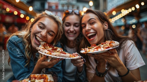 © chutikan, Obraz premium Group of three friends eat pizza and drink beer in a restaurant during their day break.