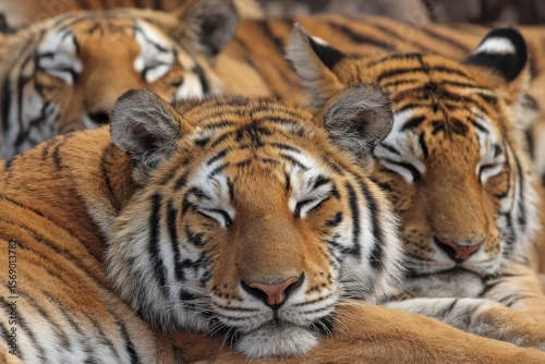 © Vlad, Fototapeta premium Group of Tigers Resting in Indian National Park. Wild Bengal Cats in Nature
