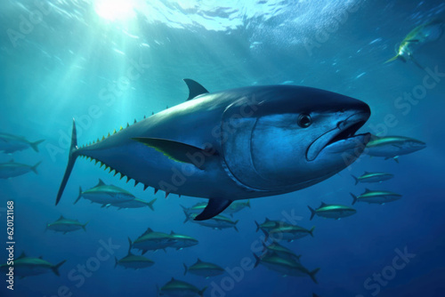 Fototapeta premium Group of tuna swimming gracefully in the crystal-clear sea, surrounded by...