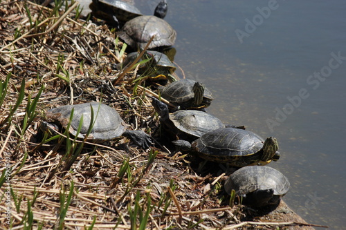© Sandra, Fototapeta premium Group of turtles chilling at the bank