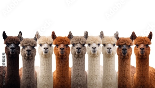 © AkuAku, Fototapeta premium Group of vibrant alpacas lined up highlighting wool quality, livestock care