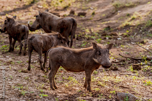 Fototapeta premium Group of Warthogs ( Phacochoerus africanus ) in evening sun, Kruger National Park, South Africa