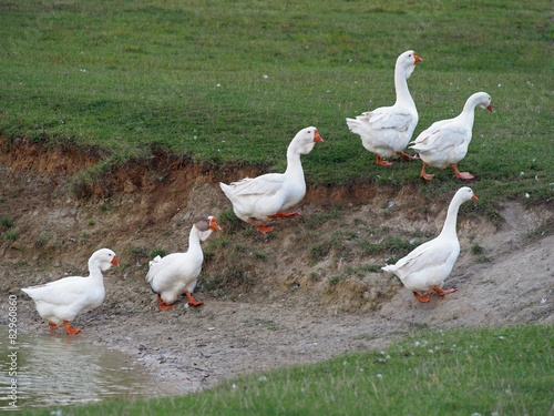 © goldika, Obraz premium Group of white domestic geese on a lakeshore