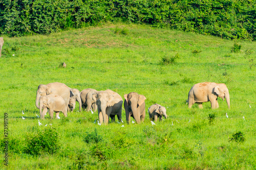 © goldquest, Obraz premium Group of wild elephants eating grass in the meadow