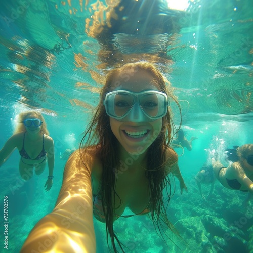 © arti om, Fototapeta premium group of women underwater taking selfie, in the style of expressive movement