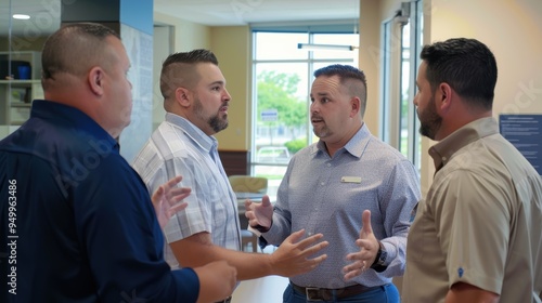 © Shozib, Fototapeta premium Group of workers having a serious conversation about work in an office building