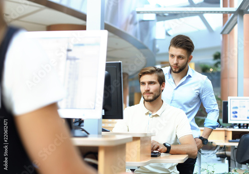 Fototapeta premium Group of young confident business people analyzing data using computer while spending time in the office.