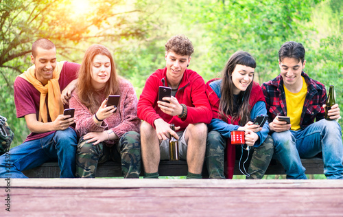© akhenatonimages, Obraz premium Group of young friends in a row holding mobile phone looking down smiling - Happy teenagers on hiking clothing sitting outdoor using smartphone - Concept of teens friendship , technology addiction
