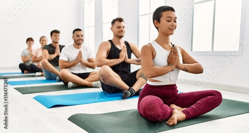 Naklejka premium Group of young hispanic people smiling happy training yoga at sport center.