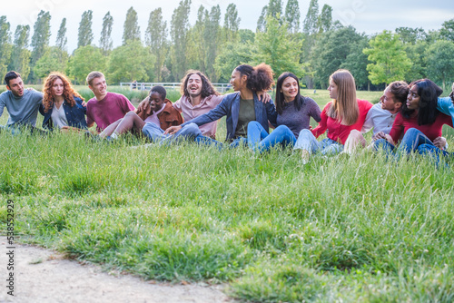 Obraz premium Group of young people from different ethnicities and cultures having a fun time together outdoors