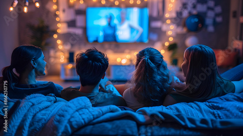Obraz premium Group of young people gathered watching a movie at home. Back view. Concept:...