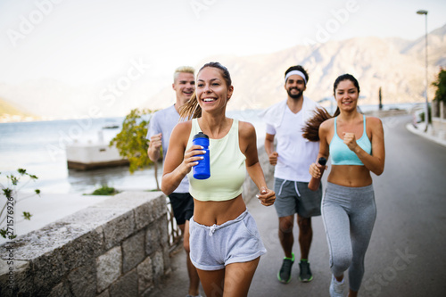 © NDABCREATIVITY, Obraz premium Group of young people jogging and running outdoors in nature