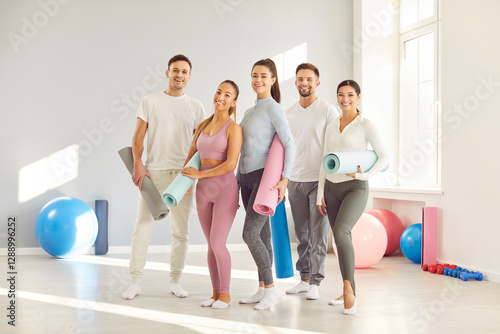 Fototapeta premium Group of young sporty happy people posing, fitness club sportswomen team holding yoga mats. Active friends before, after exercise or sport instruction, recreational activity together, balance work