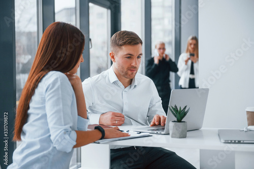 © standret, Obraz premium Group of young successful team that working and communicating together indoors in office
