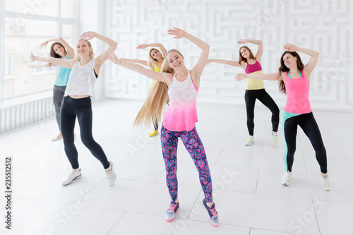 © Dmitry Zimin, Fototapeta premium Group of young women posing with arms raised while having a fitness dance class