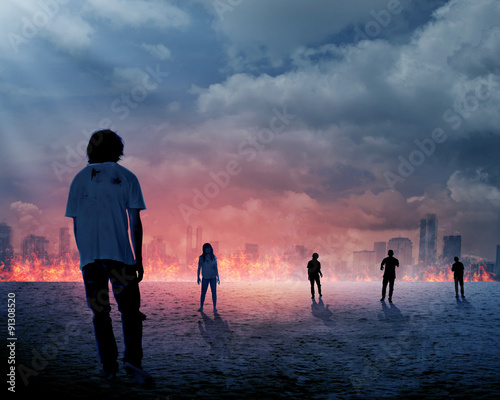 © Leo Lintang, Fototapeta premium Group of zombie over burn city background