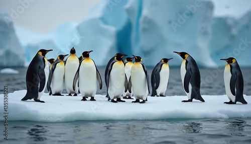 © miss irine, Obraz premium Group penguins stand on ice floe against backdrop icebergs. Antarctic landscape, cold winter season. Birds, icebergs, blue water, sea, ocean, snow, cold, wildlife, animals, environment.