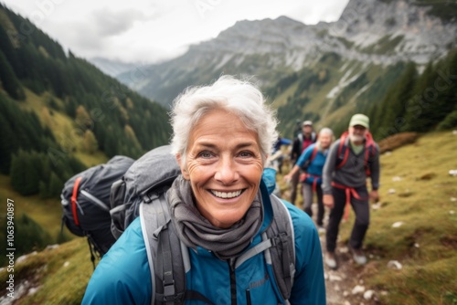 Naklejka premium Group portrait of a diverse people hiking in mountains