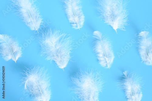 © Ksenia, Obraz premium group white fluffy bird feather from a chicken on a blue background. regular pattern