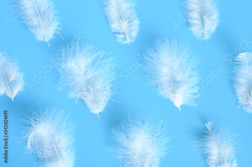 © Ksenia, Obraz premium group white fluffy bird feather from a chicken on a blue background. regular pattern