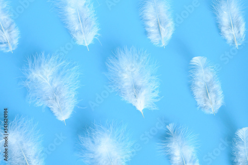 © Ksenia, Obraz premium group white fluffy bird feather from a chicken on a blue background. regular pattern