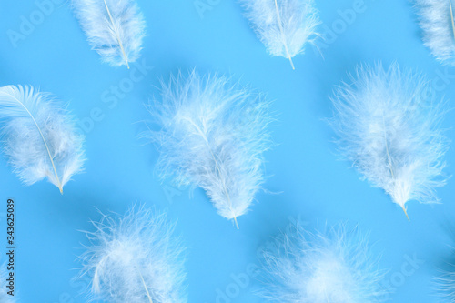 © Ksenia, Obraz premium group white fluffy bird feather from a chicken on a blue background. regular pattern