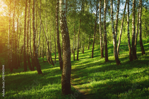 Fototapeta premium Grove of birches with young green leaves at sunset or sunrise in spring or...