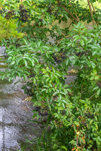 Fototapeta premium Grow black elderberry in river background y juicy, vitamin-rich berries from...