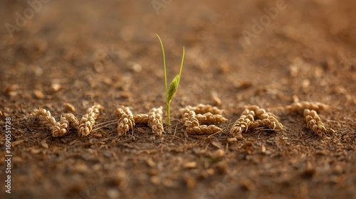 Fototapeta premium Growing green plant from wheat seeds in natural soil focused close-up view symbolizing life and growth