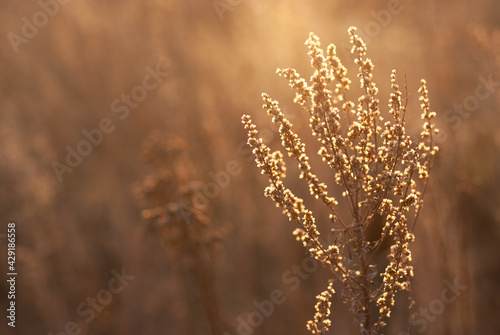 © awindrunner, Fototapeta premium Growing wild grass wormwood in the field during the evening warm summer sunset