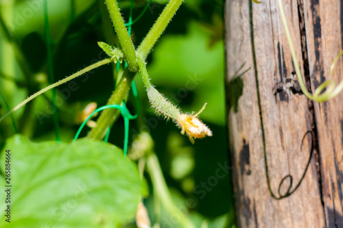 Naklejka premium Growth and blooming of greenhouse cucumbers, growing organic food. Cucumbers...