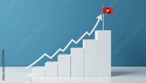 Fototapeta premium Growth Chart Representation with White Blocks and Red Flag on Blue Background Showing Progress and Achievement