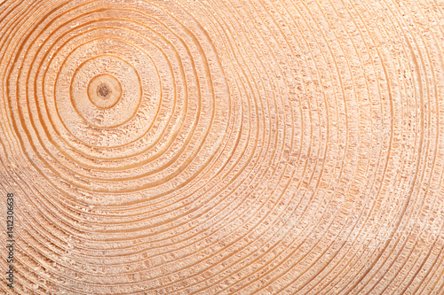 Naklejka premium Growth rings of a spruce tree. Cross section of a stem, showing age and past climate conditions. Each light ring and dark ring represents one year. Wider rings indicate favorable growing conditions.