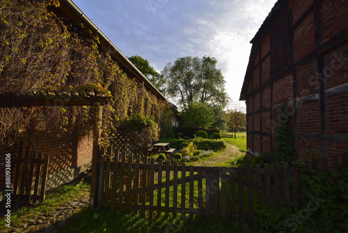 Obraz premium Gruene Landschaft in morgendlicher Sonne bei blauem Himmel und weissen Wolken, Green landscape in the morning sun with blue sky and white clouds