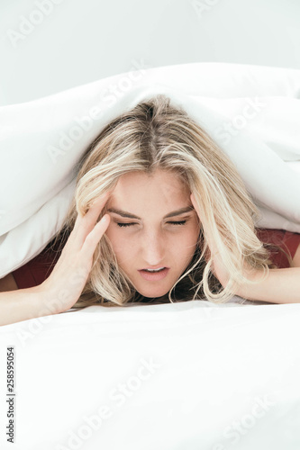 Fototapeta premium Grumpy blonde girl under white covers