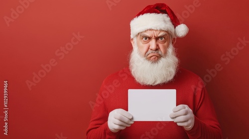 © saokaew, Naklejka premium Grumpy santa's holiday mood a captivating depiction of festive frustration with a blank sign