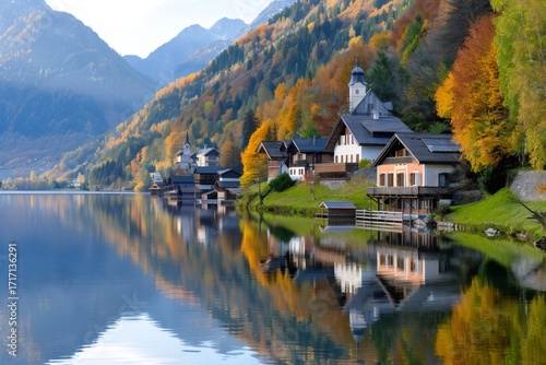 Fototapeta premium Grundlsee reflecting traditional austrian houses during autumn season