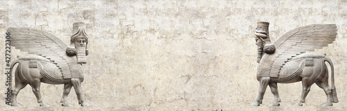 Fototapeta premium Grunge background with stone texture and two lamassu