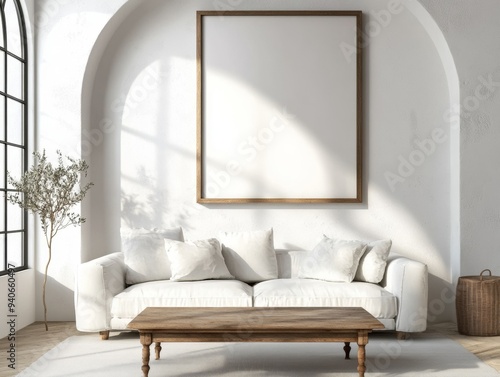 © yendisupiandi, Fototapeta premium Grunge coffee table with art deco white sofa and arched window in minimalist living room