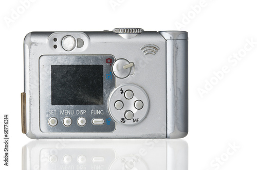 © unclepodger, Obraz premium Grunge compact photo camera on white backdrop