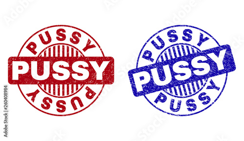 © imagecatalog, Obraz premium Grunge PUSSY round stamp seals isolated on a white background. Round seals with grunge texture in red and blue colors. Vector rubber overlay of PUSSY label inside circle form with stripes.