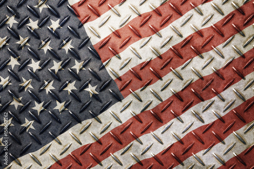 © breakingthewalls, Naklejka premium Grunge vintage American US flag over old metal