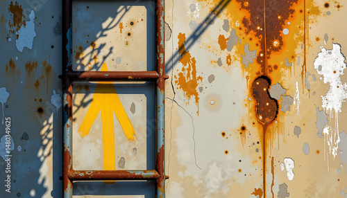 © Natalia, Naklejka premium grungy concrete wall with a rusty ladder and arrow symbol