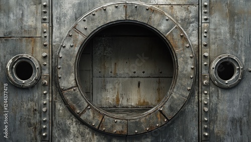 © iting, Fototapeta premium Grungy metal door with circular opening and rivets.