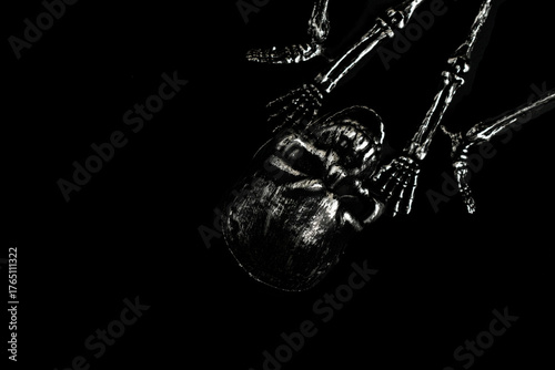© Sergio Palacio, Obraz premium Grungy Silver Skeleton Lying on a Pure Black Background in Low Key Lighting for Halloween Horror, Death and Mystery Concept