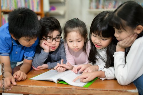 Fototapeta premium Grupa azjatyckich dzieci czytanie książki w bibliotece szkolnej z półką z książkami w tle, koncepcja edukacji azjatyckich dzieci