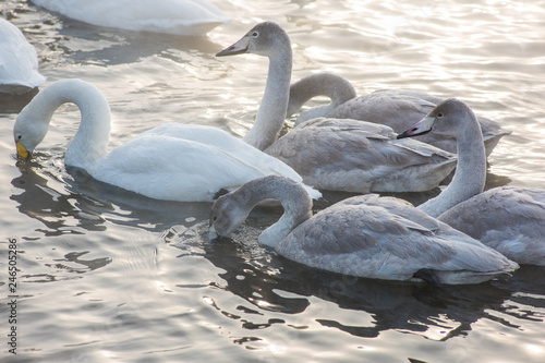 © olinchuk, Obraz premium Grupa piękne białe łabędzie krzykliwe pływanie w niezamarzającym jeziorze zimą. Wiek ptaków z młodym lęgiem, koncepcja rodziny