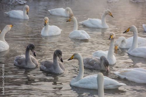 © olinchuk, Obraz premium Grupa piękne białe łabędzie krzykliwe pływanie w niezamarzającym jeziorze zimą. Wiek ptaków z młodym lęgiem, koncepcja rodziny