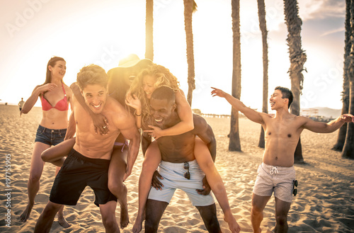 © oneinchpunch, Fototapeta premium Grupa przyjaciół robi wielkie przyjęcie i gry na plaży
