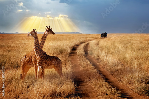 © delbars, Obraz premium Grupa żyraf w Parku Narodowym Serengeti na tle zachodu słońca z promieniami słońca. Afrykańskie safari. Piękne promienie światła na niebie.